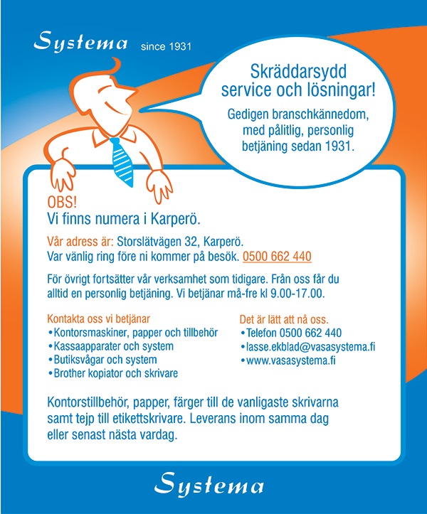Vasa Systema Kb, Storslätvägen 32, 65630 Karperö. Tel. 0500 662 440